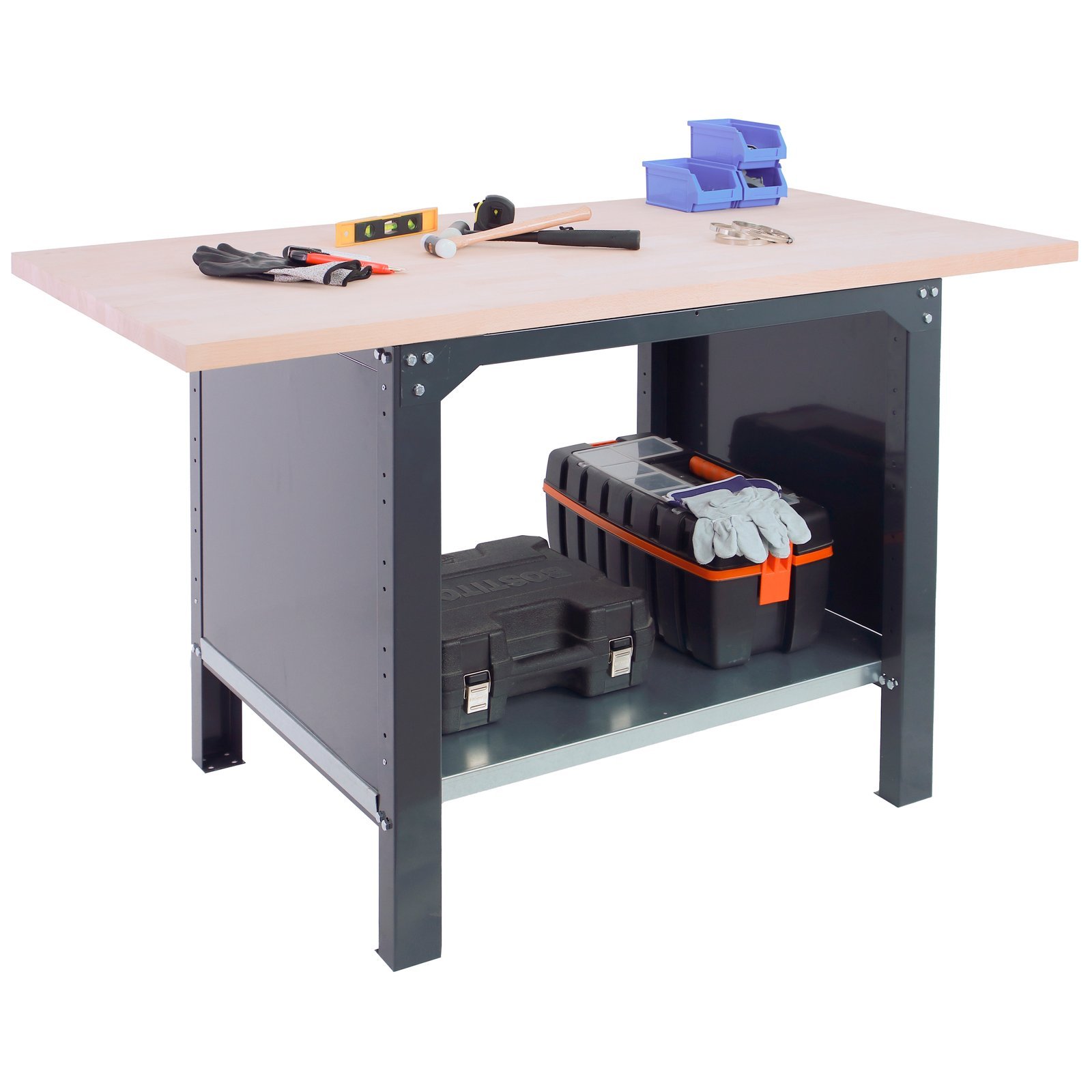 Banco de trabajo con tornillos y encimera de haya laminada, y cuenta con un estante inferior que tiene una capacidad de carga de 300 kgs aportandole mucha resistencia al banco de trabajo. La encimera de haya laminada de 32 mm de espesor que aguanta mejor el impacto y los golpes. Es de color ANTRACITA. Las dimensiones de este banco de trabajo son, 865x1200x750 mm. La encimera principal tiene una capacidad de carga en estatico de 1000 kgs de forma uniformemente repartida por la superficie. Esta fabricado en Europa por Simonrack y se monta facil siguiendo las instrucciones. Incluye tapas laterales met licas para mejor seguridad y acabado