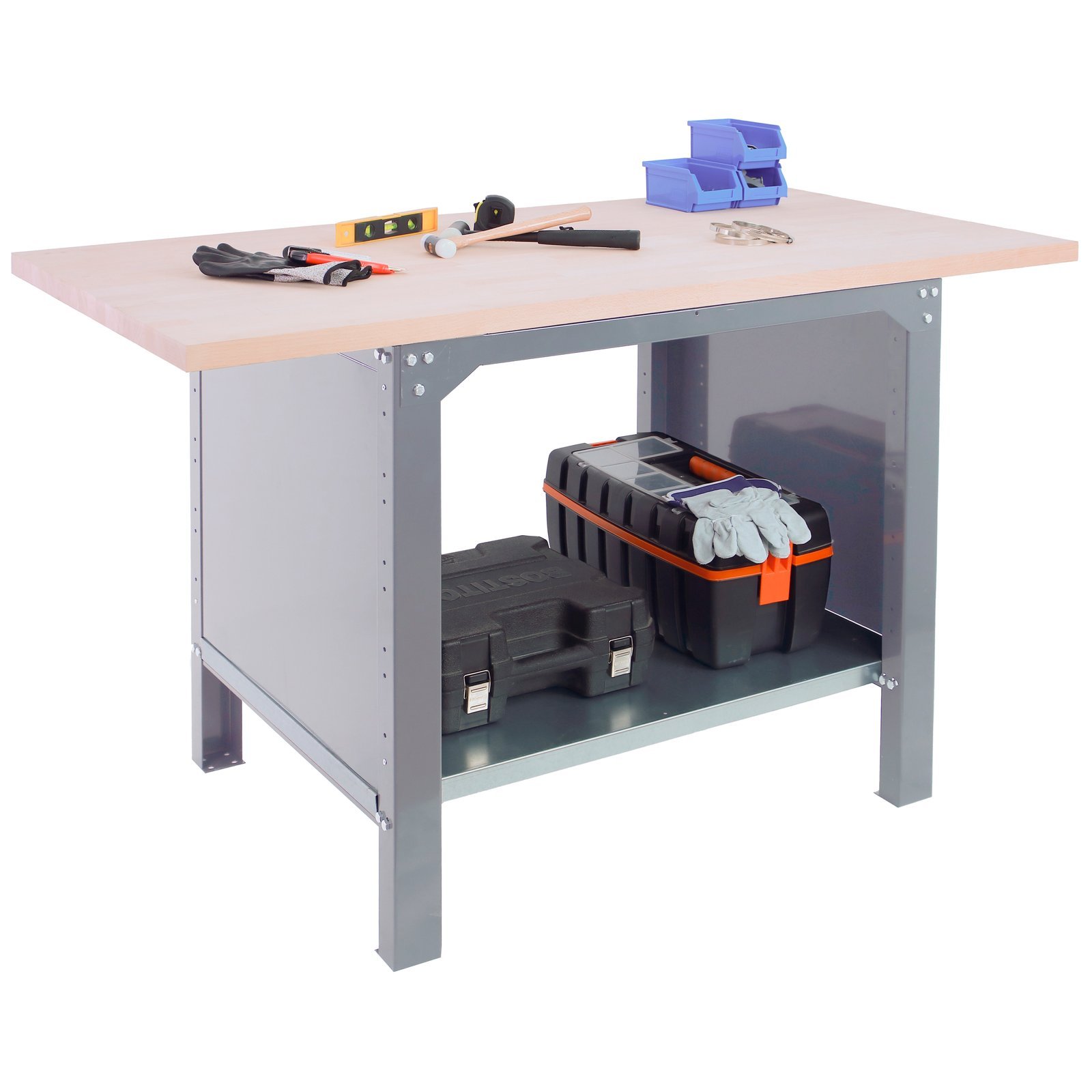 Banco de trabajo con tornillos y encimera de haya laminada, y cuenta con un estante inferior que tiene una capacidad de carga de 300 kgs aportandole mucha resistencia al banco de trabajo. La encimera de haya laminada de 32 mm de espesor que aguanta mejor el impacto y los golpes. Es de color GRIS. Las dimensiones de este banco de trabajo son, 865x1200x750 mm. La encimera principal tiene una capacidad de carga en estatico de 1000 kgs de forma uniformemente repartida por la superficie. Esta fabricado en Europa por Simonrack y se monta facil siguiendo las instrucciones. Incluye tapas laterales met licas para mejor seguridad y acabado