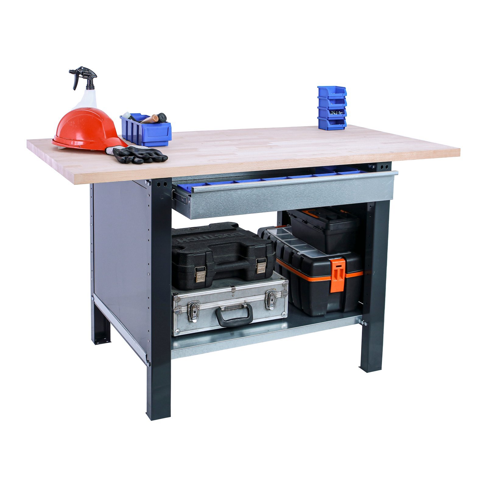 Banco de trabajo con tornillos y encimera de haya laminada, y cuenta con un estante inferior que tiene una capacidad de carga de 300 kgs aportandole mucha resistencia al banco de trabajo. Con un cajon metalico con guias telescopicas para mayor facilidad de uso. La encimera de haya laminada de 32 mm de espesor que aguanta mejor el impacto y los golpes. Es de color ANTRACITA. Las dimensiones de este banco de trabajo son, 865x1800x750 mm. La encimera principal tiene una capacidad de carga en estatico de 1000 kgs de forma uniformemente repartida por la superficie. Esta fabricado en Europa por Simonrack y se monta facil siguiendo las instrucciones. Incluye tapas laterales met licas para mejor seguridad y acabado
