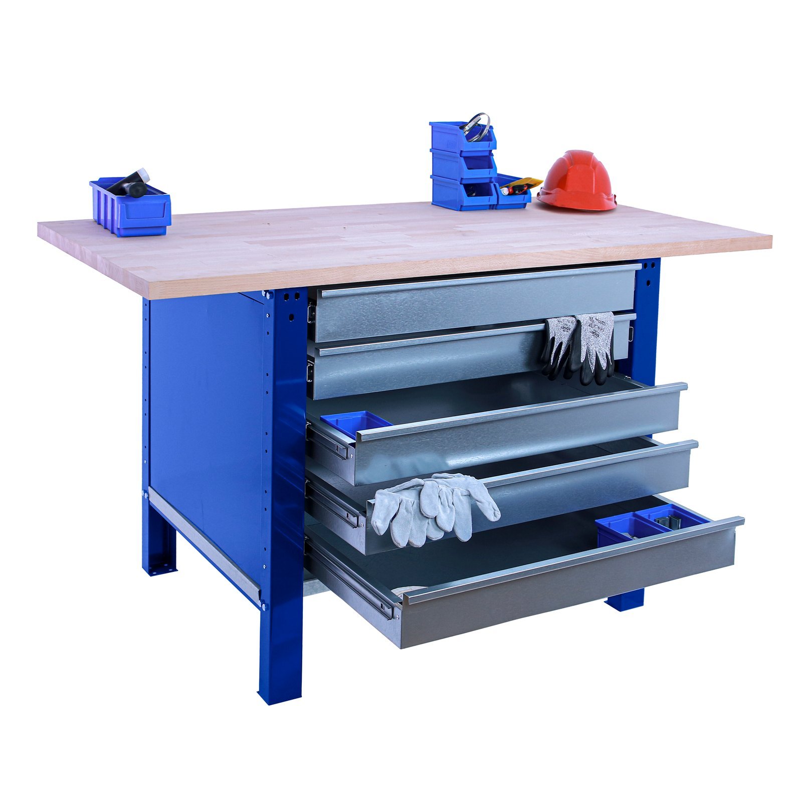 Banco de trabajo con tornillos y encimera de haya laminada, y cuenta con un estante inferior que tiene una capacidad de carga de 300 kgs aportandole mucha resistencia al banco de trabajo. Con 5 cajones metalicos con guias telescopicas para mayor facilidad de uso. La encimera de haya laminada de 32 mm de espesor que aguanta mejor el impacto y los golpes. Es de color AZUL. Las dimensiones de este banco de trabajo son, 865x1500x750 mm. La encimera principal tiene una capacidad de carga en estatico de 1000 kgs de forma uniformemente repartida por la superficie. Esta fabricado en Europa por Simonrack y se monta facil siguiendo las instrucciones. Incluye tapas laterales met licas para mejor seguridad y acabado