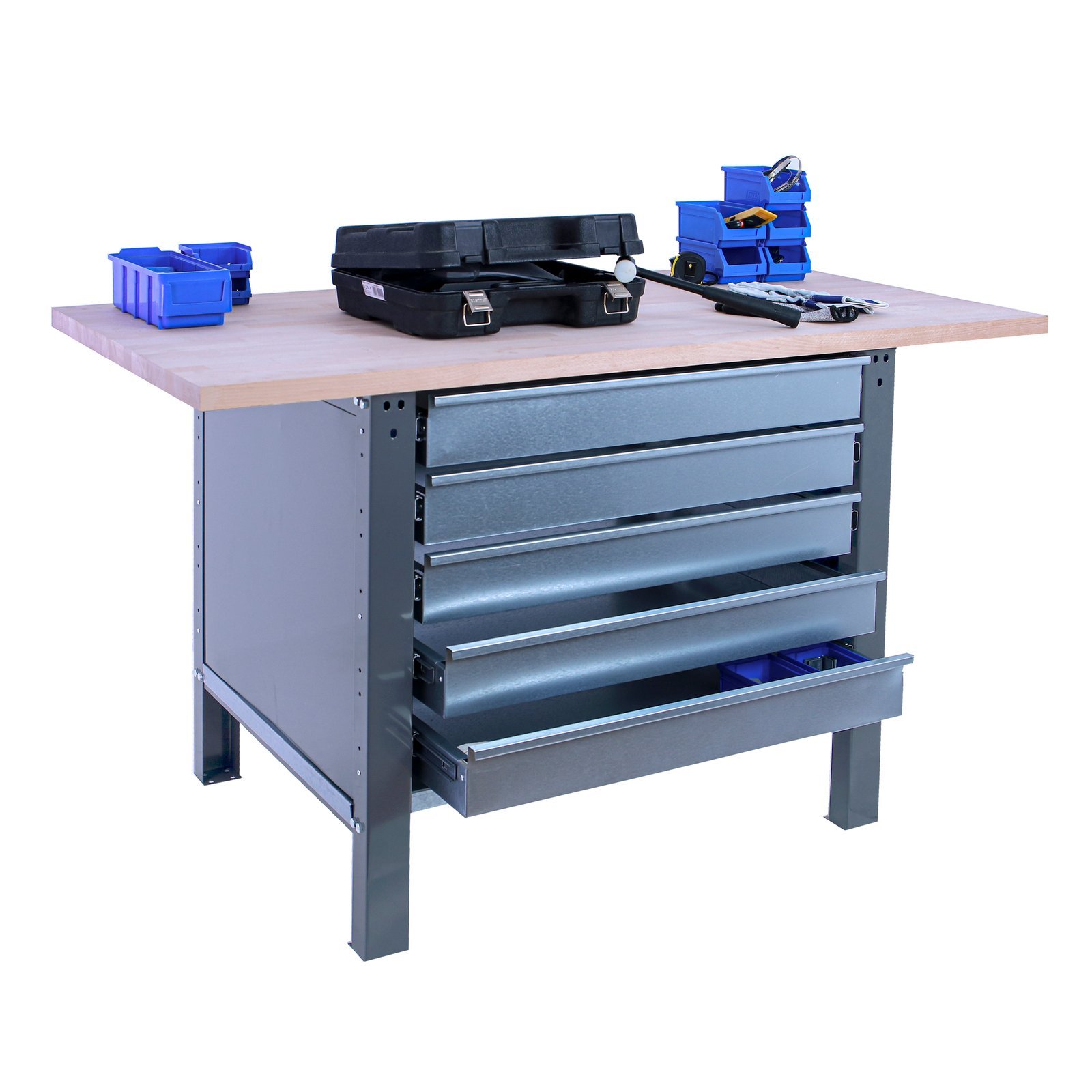 Banco de trabajo con tornillos y encimera de haya laminada, y cuenta con un estante inferior que tiene una capacidad de carga de 300 kgs aportandole mucha resistencia al banco de trabajo. Con 5 cajones metalicos con guias telescopicas para mayor facilidad de uso. La encimera de haya laminada de 32 mm de espesor que aguanta mejor el impacto y los golpes. Es de color GRIS. Las dimensiones de este banco de trabajo son, 865x1800x750 mm. La encimera principal tiene una capacidad de carga en estatico de 1000 kgs de forma uniformemente repartida por la superficie. Esta fabricado en Europa por Simonrack y se monta facil siguiendo las instrucciones. Incluye tapas laterales met licas para mejor seguridad y acabado
