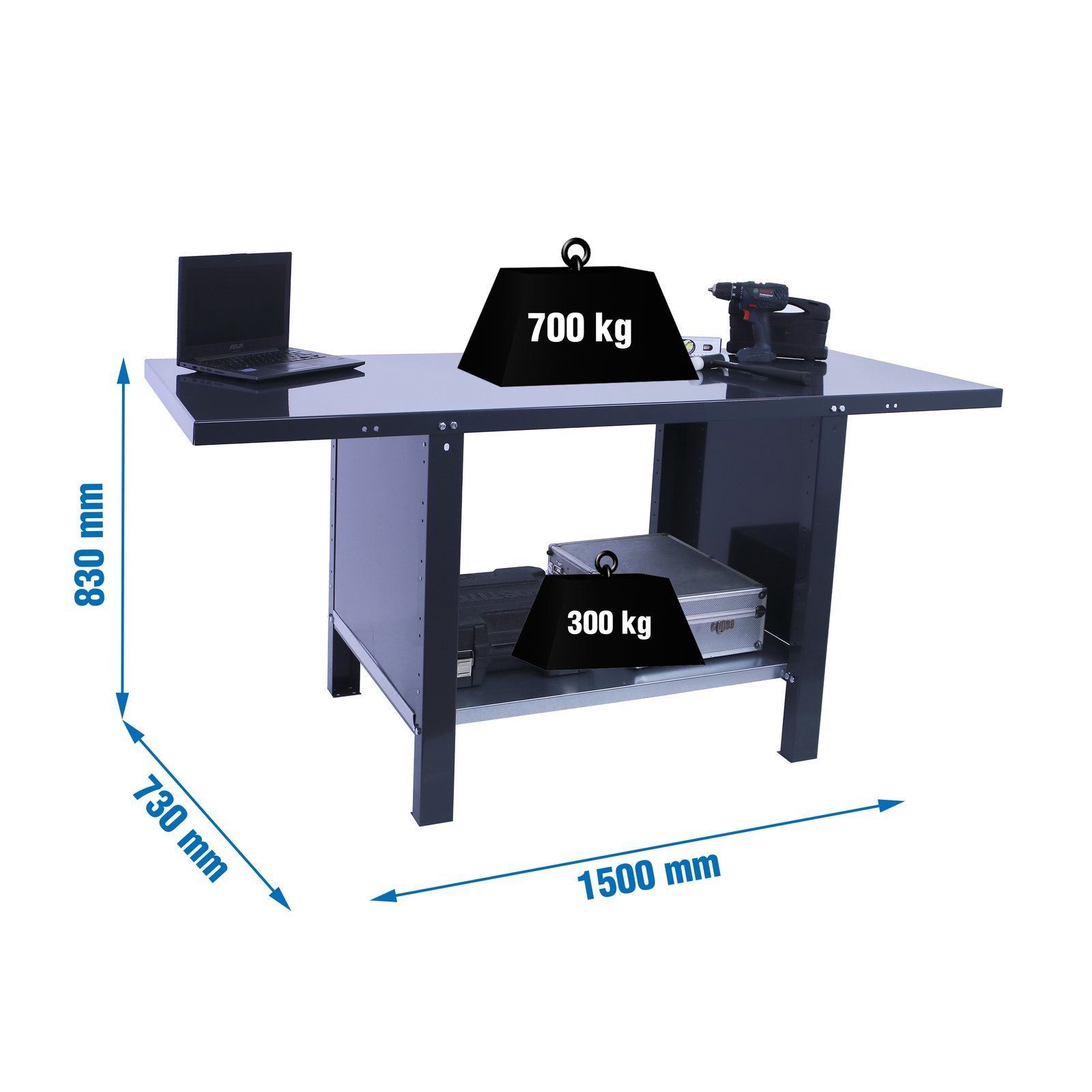 Banco de trabajo con tornillos y bandeja metalica, y cuenta con un estante inferior que aguanta 300kgs, aportandole mucha resistencia al banco de trabajo. Es de color ANTRACITA. Las dimensiones de este banco de trabajo son, 830x1500x730 mm. La encimera principal tiene una capacidad de carga de 600 kgs. Esta fabricado en Europa por Simonrack y se monta facil siguiendo las instrucciones. Incluye tapas laterales met licas para mejor seguridad y acabado