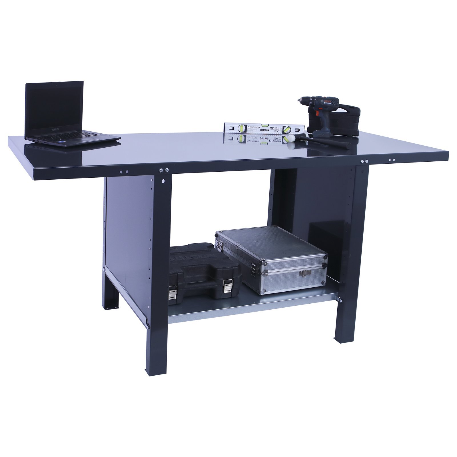 Banco de trabajo con tornillos y bandeja metalica, y cuenta con un estante inferior que aguanta 300kgs, aportandole mucha resistencia al banco de trabajo. Es de color ANTRACITA. Las dimensiones de este banco de trabajo son, 830x1800x730 mm. La encimera principal tiene una capacidad de carga de 600 kgs. Esta fabricado en Europa por Simonrack y se monta facil siguiendo las instrucciones. Incluye tapas laterales met licas para mejor seguridad y acabado