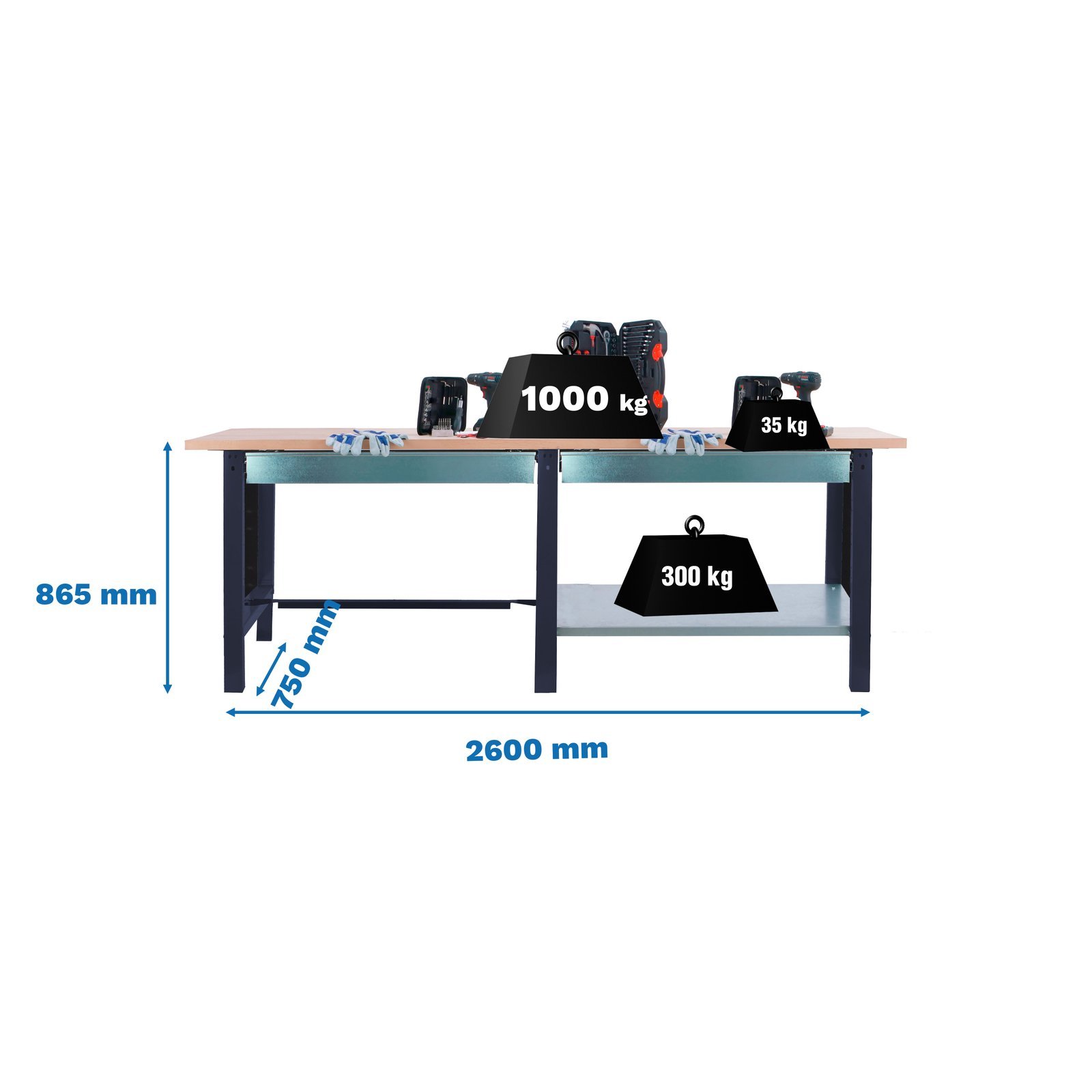 Banco de trabajo con tornillos y encimera de haya laminada, y cuentan con estantes inferiores que tienen una capacidad de carga de 300 kgs aportandole mucha resistencia al banco de trabajo. Cuenta con 2 cajones metalicos con guias telescopicas para una mayor facilidad de uso. La encimera de haya laminada de 32 mm de espesor que aguanta mejor el impacto y los golpes. Es de color ANTRACITA. Las dimensiones de este banco de trabajo son, 865x2600x750 mm. La encimera principal tiene una capacidad de carga en estatico de 1000 kgs de forma uniformemente repartida por la superficie. Esta fabricado en Europa por Simonrack y se monta facil siguiendo las instrucciones. Incluye tapas laterales met licas para mejor seguridad y acabado