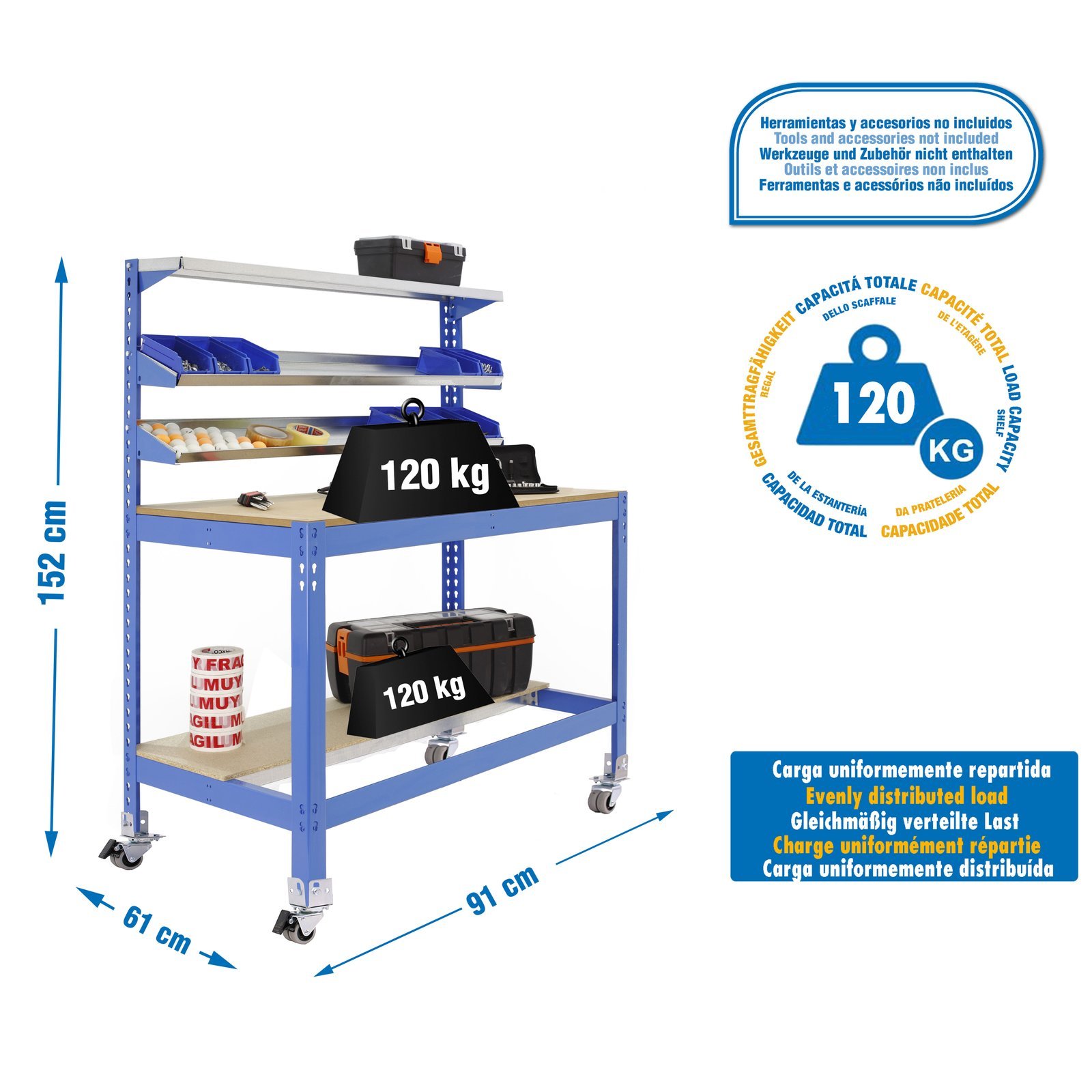 Banco de trabajo metalico de color AZUL/MADERA con capacidad de carga total de 120 kg. Las medidas (alto x ancho x fondo) son 1520x910x610 mm. Contiene 3 repisas superiores para almacenaje de herramientas. Cada repisa superior soporta hasta 25 kg de capacidad de carga. Producto europeo, calidad europea, podras encontrar las instrucciones de montaje en su interior o en este enlace, https, //www. youtube. com/watch?v=gw-_YZh8bjY. Medidas en uso del producto, 1520x910x610 mm