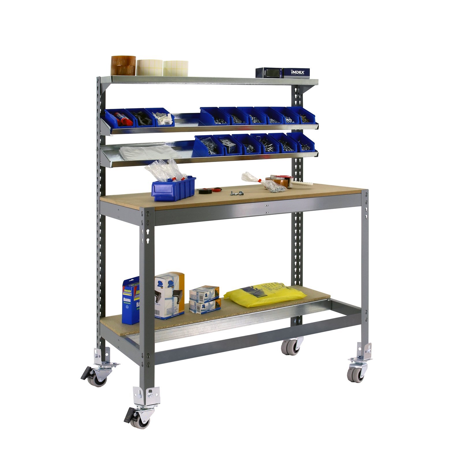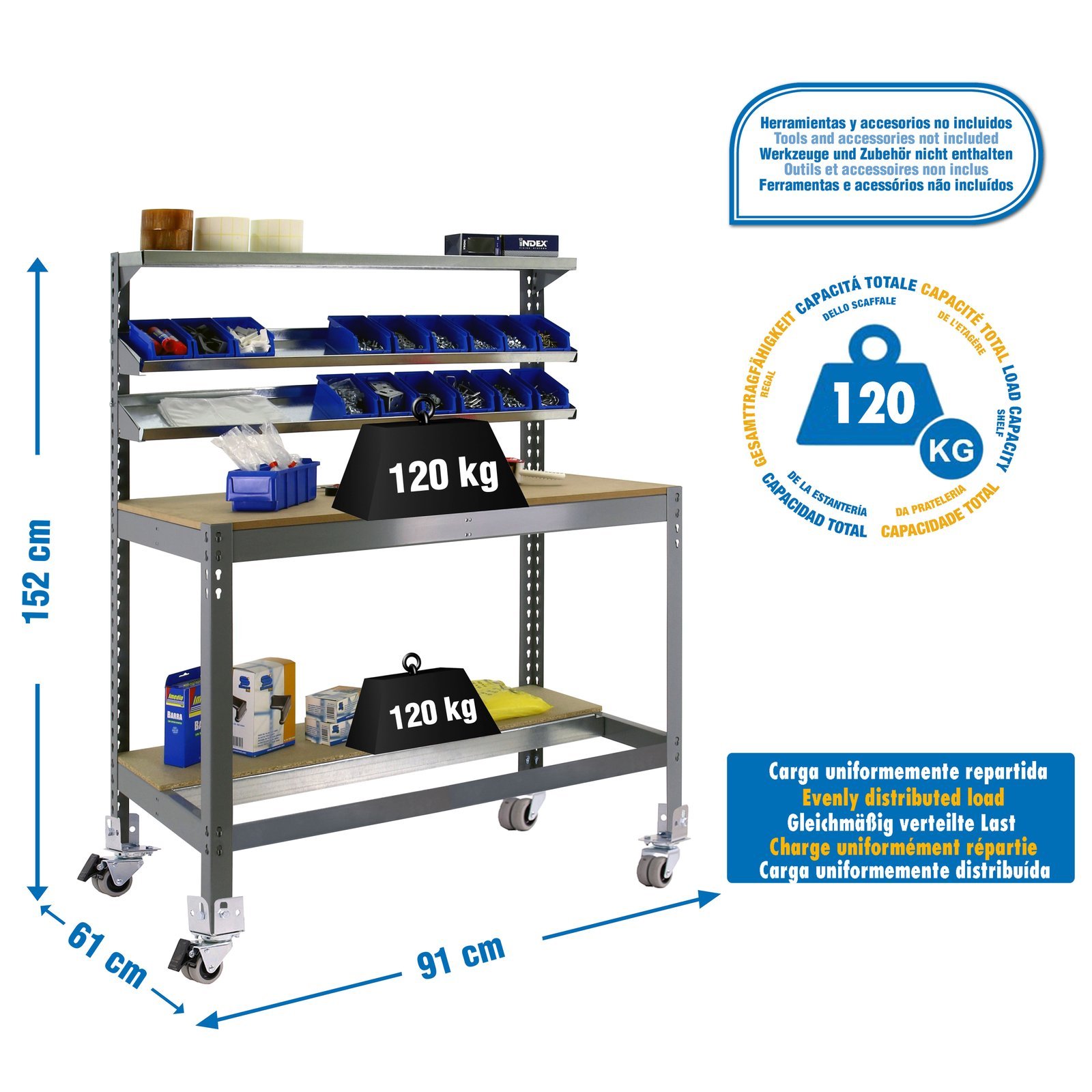 Banco de trabajo metalico de color GRIS/MADERA con capacidad de carga total de 120 kg. Las medidas (alto x ancho x fondo) son 1520x910x610 mm. Incluye 4 ruedas (2 con freno y 2 sin freno). Contiene 3 repisas superiores para almacenaje de herramientas. Cada repisa superior soporta hasta 25 kg de capacidad de carga. Producto europeo, calidad europea, podras encontrar las instrucciones de montaje en su interior. Medidas en uso del producto, 1520x910x610 mm