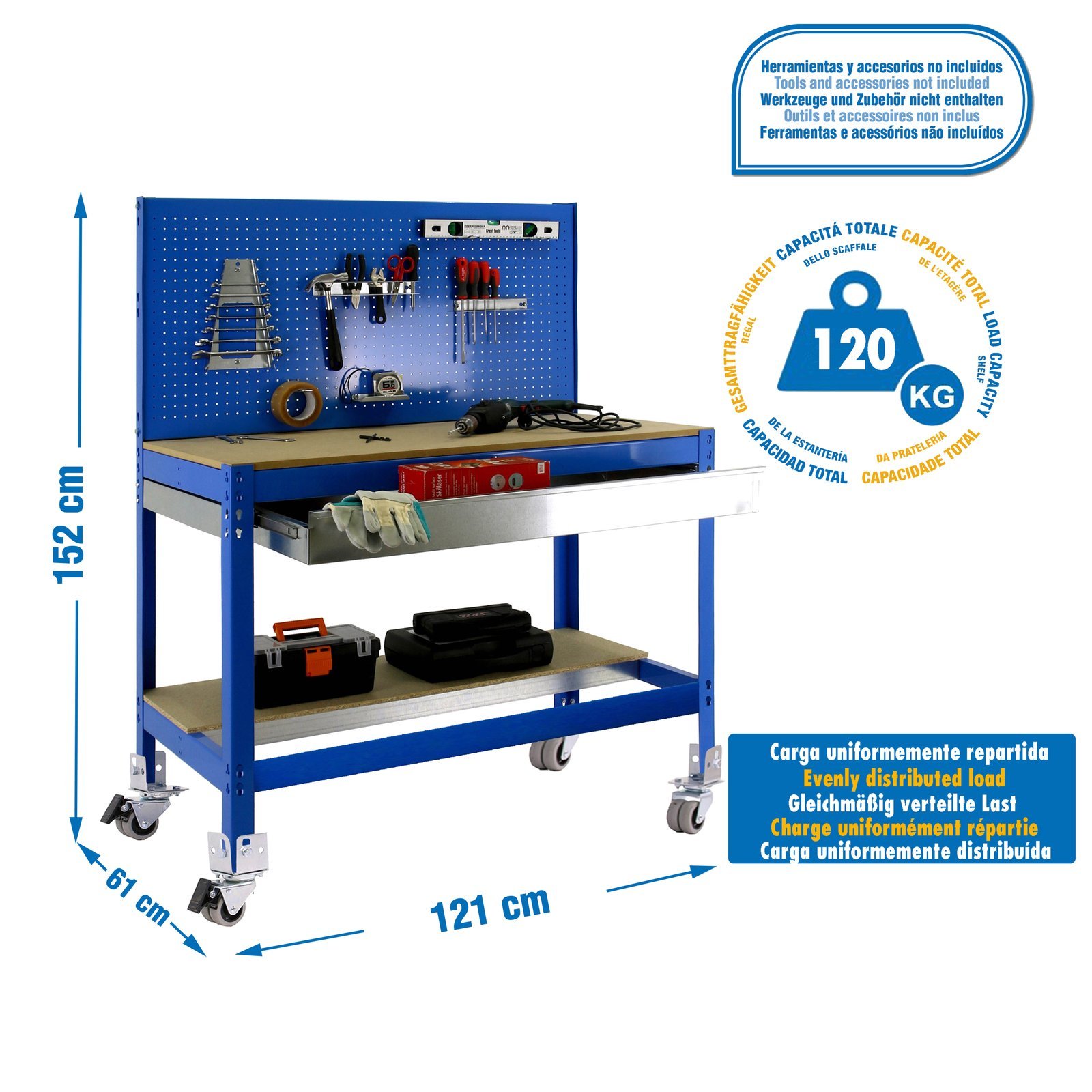 Banco de trabajo metalico de color AZUL/MADERA con capacidad de carga de 120 kg. Las medidas (alto x ancho x fondo) son 1520x1210x610 mm. Incluye ruedas y cajon metalico de 35 kg de capacidad. Producto europeo, calidad europea, podras encontrar las instrucciones de montaje en su interior. Medidas en uso del producto, 1520x1210x610 mm