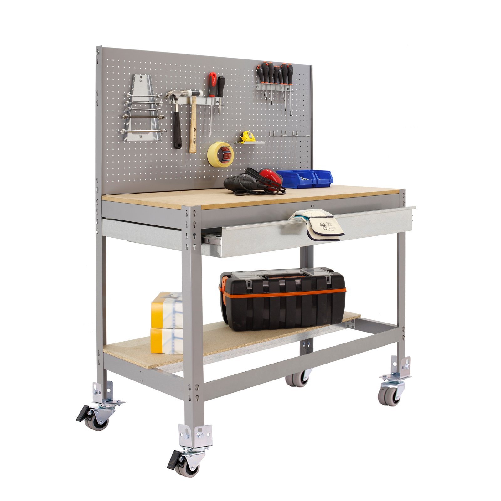 Banco de trabajo metalico de color GRIS/MADERA con capacidad de carga de 120 kg. Las medidas (alto x ancho x fondo) son 1520x1210x610 mm. Incluye ruedas y cajon metalico de 35 kg de capacidad. Producto europeo, calidad europea, podras encontrar las instrucciones de montaje en su interior. Medidas en uso del producto, 1520x1210x610 mm