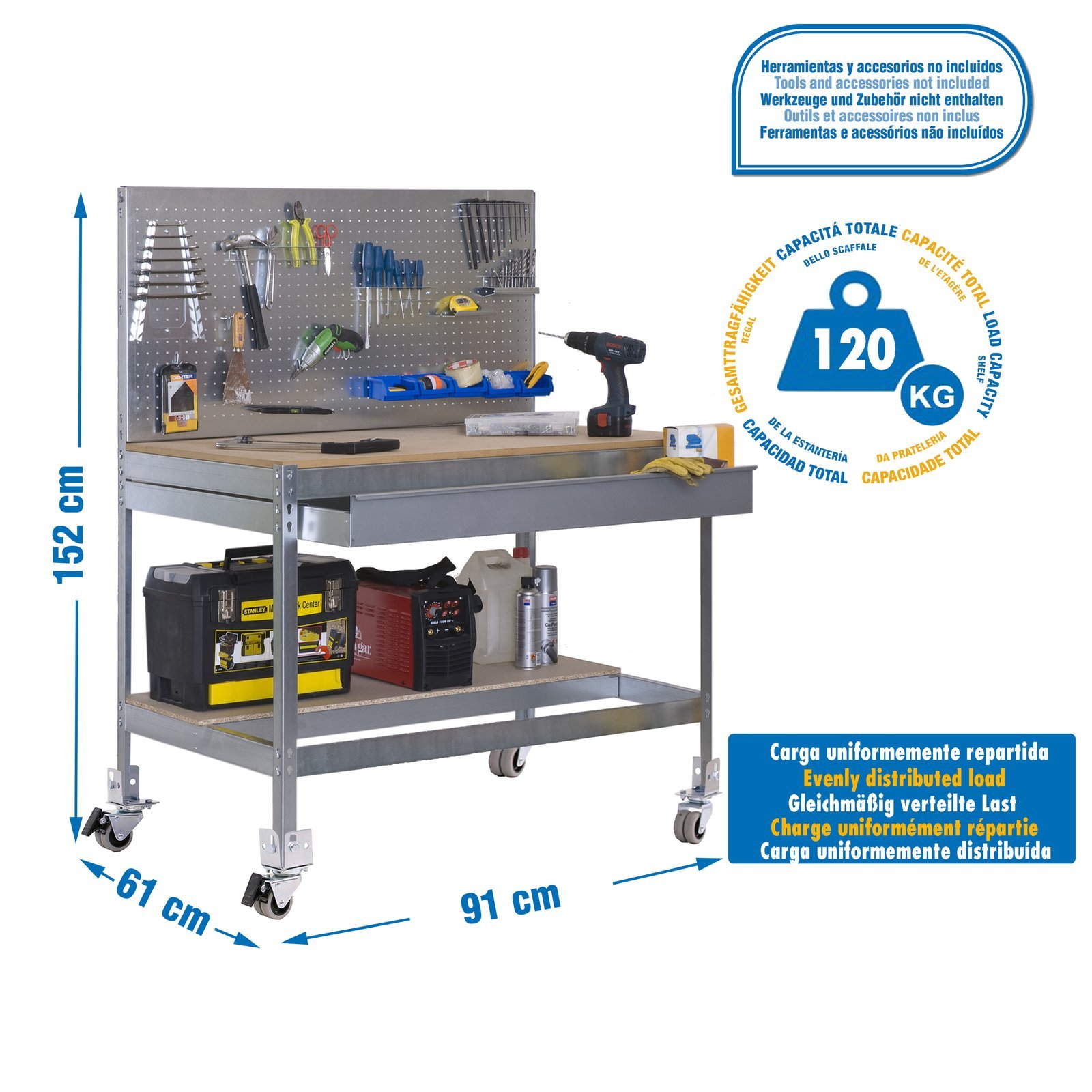 Banco de trabajo metalico de color GALVA/MADERA con capacidad de carga de 120 kg. Las medidas (alto x ancho x fondo) son 1520x910x610 mm. Incluye ruedas y cajon metalico de 35 kg de capacidad. Producto europeo, calidad europea, podras encontrar las instrucciones de montaje en su interior. Medidas en uso del producto, 1520x910x610 mm