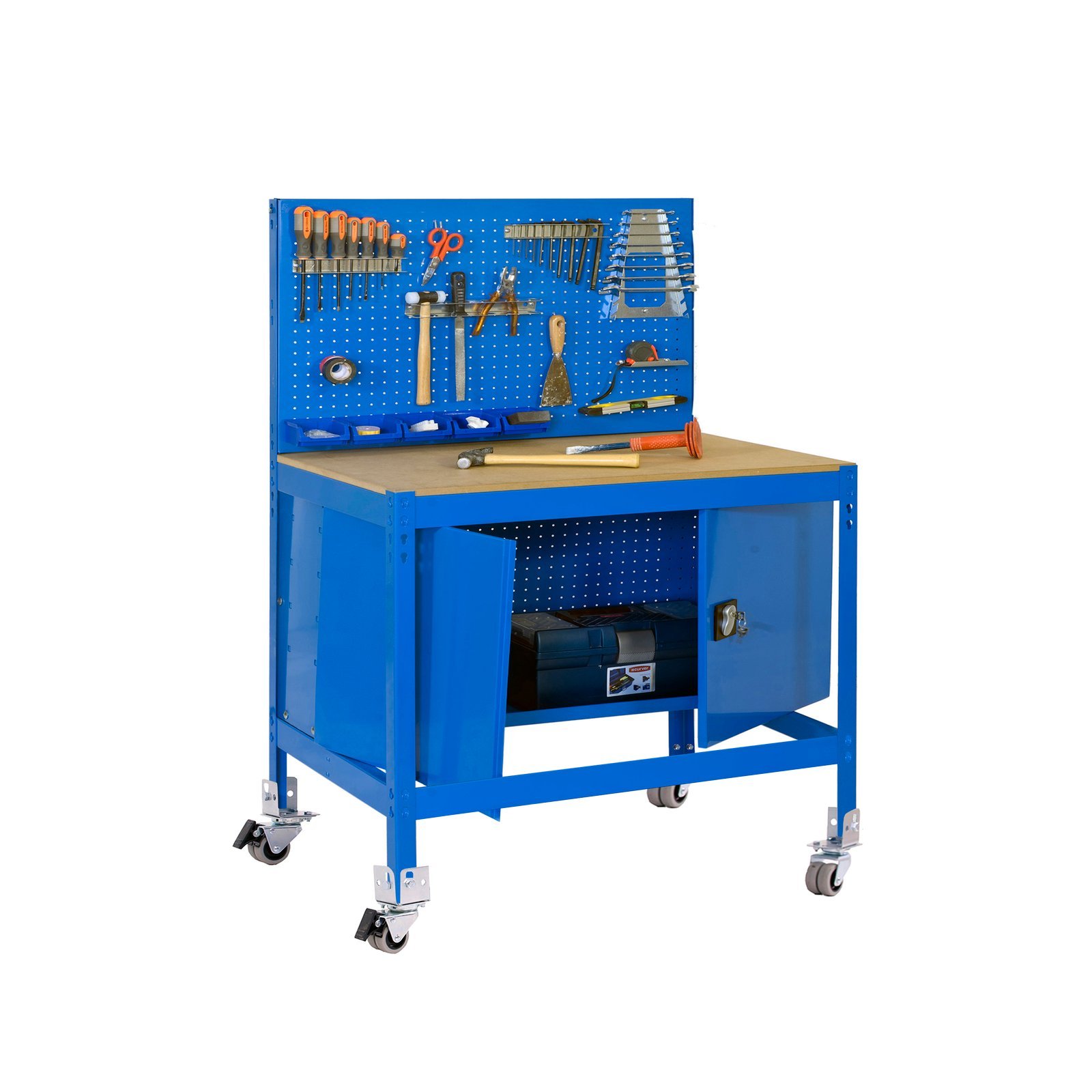 Banco de trabajo sin tornillos con bandejas de madera. Tiene 2 estantes y una capacidad de carga de 400 kgs el estante principal y 250 kgs el estante inferior. Al llevar ruedas, la capacidad de carga de la estanteria en total es de 120 kg uniformemente repartida. Incluye panel perforado para guardar herramientas y cuyo montaje si que lleva tornillos. Incluye armario para almacenaje de herramientas. Montaje facil y rapido. Manipulacion sin riesgo, sin aristas de corte. Producto fabricado en Europa por Simonrack. Medidas en uso del producto, 1520x910x610 mm