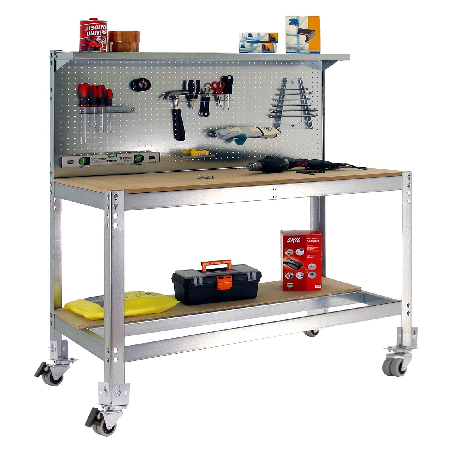 Banco de trabajo metalico de color GALVA/MADERA con capacidad de carga de 120 kg. Las medidas (alto x ancho x fondo) son 1520x1210x610 mm. Incluye ruedas. Producto europeo, calidad europea, podras encontrar las instrucciones de montaje en su interior. Medidas en uso del producto, 1520x1210x610 mm