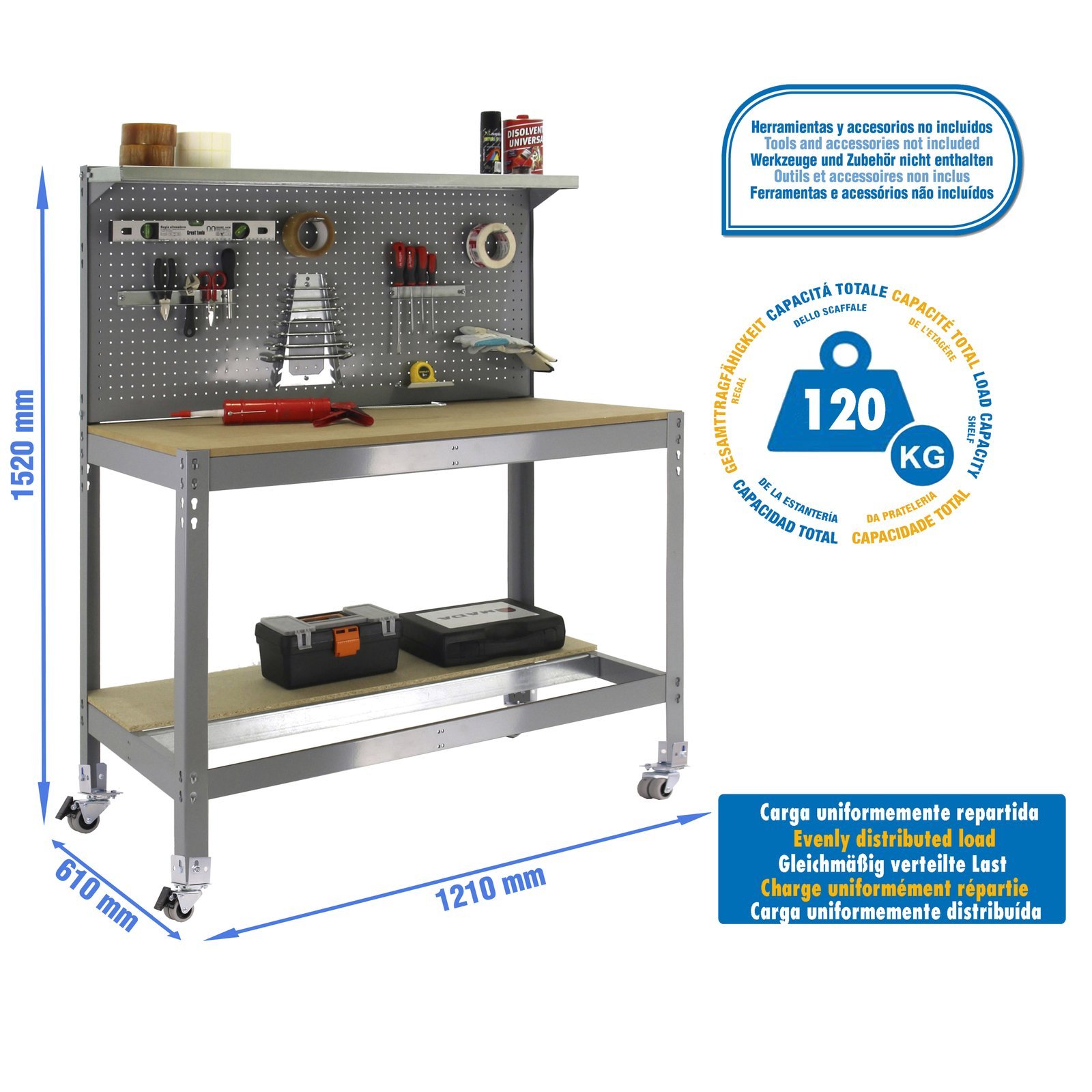 Banco de trabajo metalico de color GRIS/MADERA con capacidad de carga de 120 kg. Las medidas (alto x ancho x fondo) son 1520x1210x610 mm. Incluye ruedas. Producto europeo, calidad europea, podras encontrar las instrucciones de montaje en su interior. Medidas en uso del producto, 1520x1210x610 mm