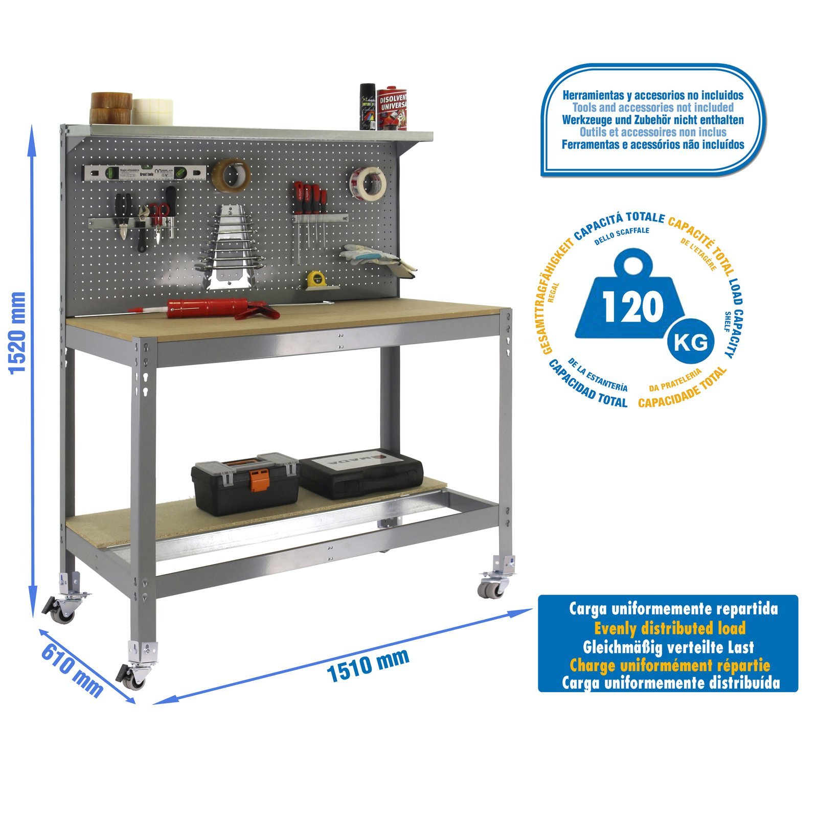 Banco de trabajo metalico de color GRIS/MADERA con capacidad de carga de 120 kg. Las medidas (alto x ancho x fondo) son 1555x1510x610 mm. Incluye ruedas. Producto europeo, calidad europea, podras encontrar las instrucciones de montaje en su interior. Medidas en uso del producto, 1520x1510x610 mm