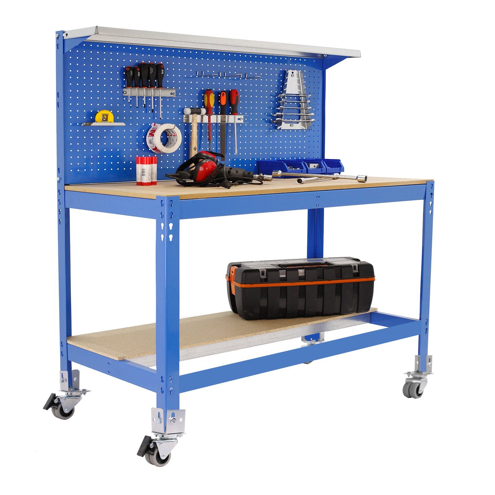 Banco de trabajo metalico de color AZUL/MADERA con capacidad de carga de 120 kg. Las medidas (alto x ancho x fondo) son 1520x910x610 mm. Incluye ruedas y cajon metalico de 35 kg de capacidad. Producto europeo, calidad europea, podras encontrar las instrucciones de montaje en su interior. Medidas en uso del producto, 1520x910x610 mm