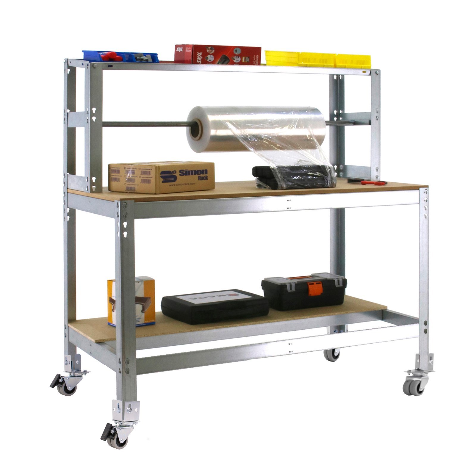Banco de trabajo sin tornillos con bandejas de madera. Montaje facil y rapido. Incluye repisa superior (montaje con tornillos) y larguero cuelga rollos. Tiene 3 estantes y una capacidad de carga de 400 kg el estante principal y 250 kg el estante inferior. La repisa superior soporta hasta 25 kg. Al llevar ruedas, la capacidad de carga de la estanteria en total es de 120 kg uniformemente repartida. El banco ideal para puestos de trabajo o tareas de empaquetado o embalaje. Manipulacion sin riesgo, sin aristas de corte. Producto fabricado en Europa por Simonrack. Medidas en uso del producto, 1520x910x760 mm