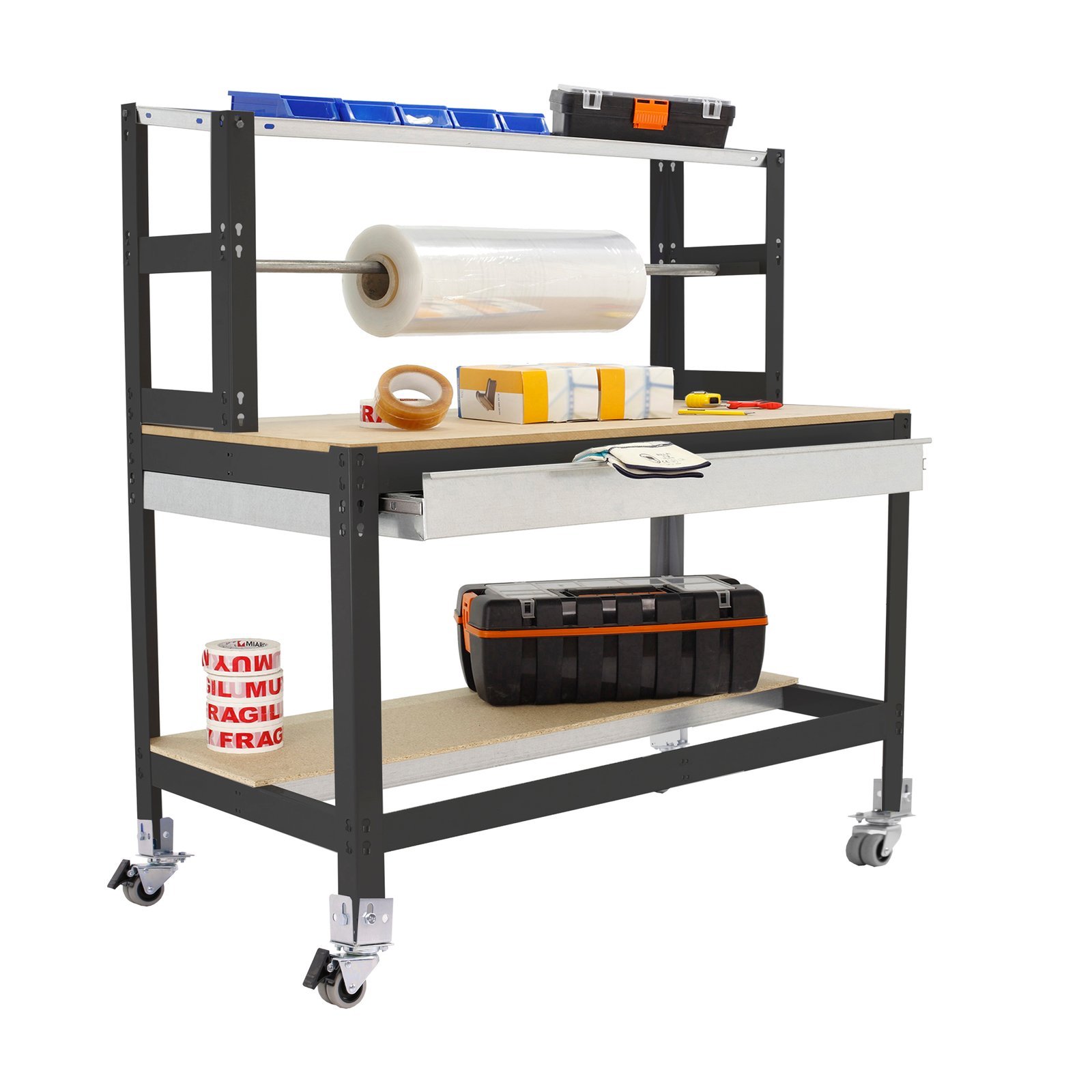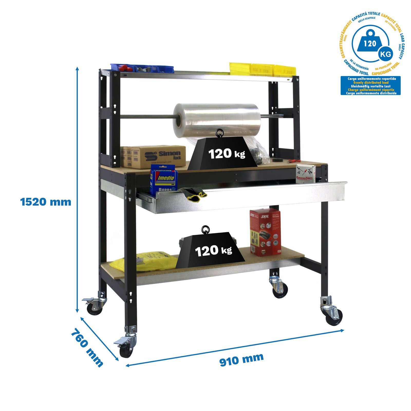 Banco de trabajo sin tornillos con bandejas de madera. Montaje facil y rapido. Color, antracita/madera. Incluye repisa superior (montaje con tornillos) y larguero cuelga rollos. Incluye cajon con guias telescopicas para almacenaje de herramientas con capacidad de carga de 35 kg. Tiene 3 estantes y una capacidad de carga de 400 kg el estante principal y 250 kg el estante inferior. La repisa superior soporta hasta 25 kg. Al llevar ruedas, la capacidad de carga de la estanteria en total es de 120 kg uniformemente repartida. El banco ideal para puestos de trabajo o tareas de empaquetado o embalaje. Manipulacion sin riesgo, sin aristas de corte. Producto fabricado en Europa por Simonrack. Medidas en uso del producto, 1520x910x760 mm