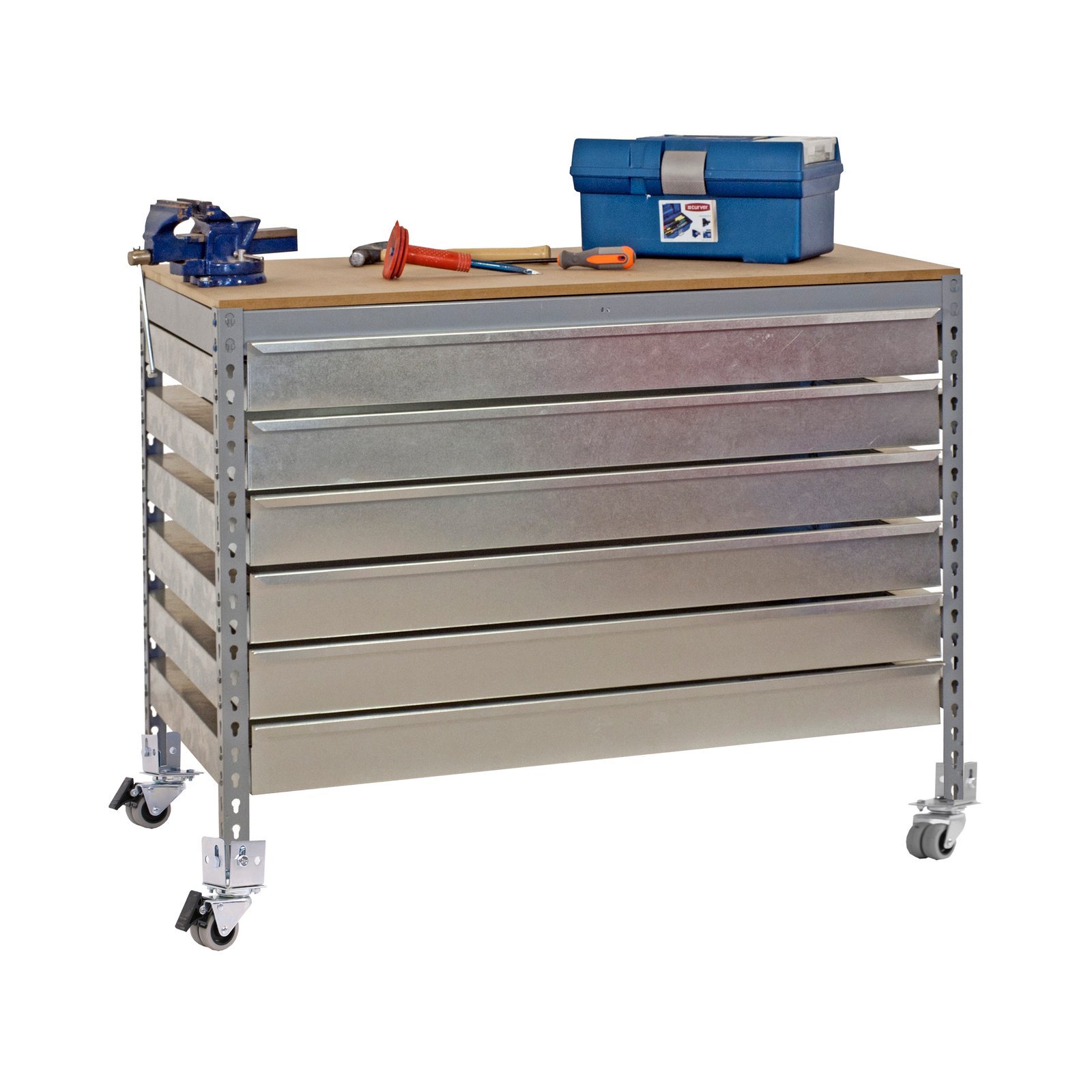 Banco de trabajo sin tornillos con bandeja de madera. Incluye multiples cajones con guias telescopicas para almacenaje de herramientas. Tiene una capacidad de carga de 600 kg el estante principal de madera. Los cajones aguantan hasta 35 kgs cada uno. Al llevar ruedas, la capacidad de carga de la estanteria en total es de 120 kg uniformemente repartida. Montaje facil y rapido. Manipulacion sin riesgo, sin aristas de corte. Producto fabricado en Europa por Simonrack. Medidas en uso del producto, 917x910x610 mm